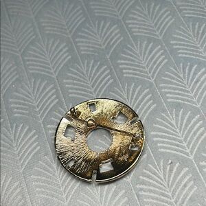Elegant circular brooch with gold tones. Perfect for adding a touch of vintage charm.