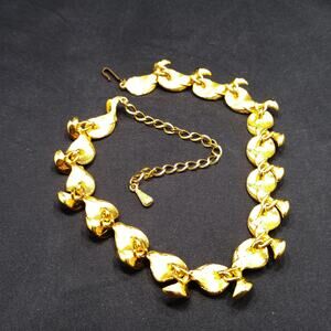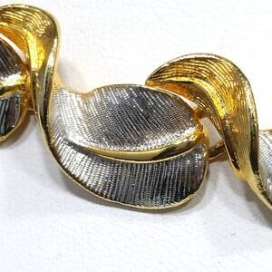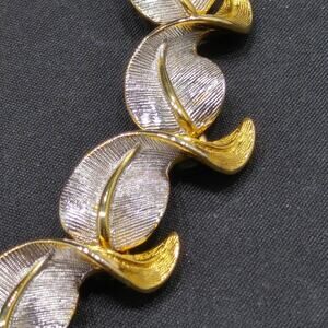 This is a beautiful vintage leaf choker necklace in gold and silver tones from the 1960s. The necklace features elegant curved leaves with a gold front and silver back, designed with a graceful turned-over tip that creates dimension and movement. Each leaf link is detailed with fine texture and subtle shine, set on a gold-plated backing. The necklace fastens with a hook clasp and extension chain for adjustable length and comfortable wear. This striking mid-century design captures the timeless glamour of the 1960s and would make a wonderful gift or a stunning addition to your vintage jewelry collection.