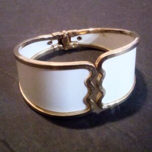 This elegant vintage clamper bracelet features a chic white finish beautifully framed in gold-tone accents. The bracelet has a sturdy hinge at the back for easy wear, with the front displaying a scalloped edge for a touch of sophistication. Measuring 1 1/4" wide at the front, this piece is in wonderful vintage condition, showing minimal signs of wear. A timeless statement piece, it’s perfect for adding vintage flair to any outfit.