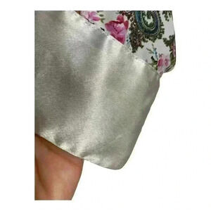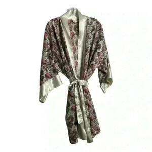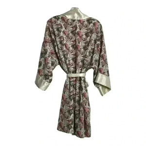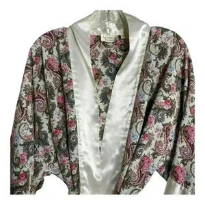 Victoria’s Secret one size vintage gold label cream satin with a gorgeous romantic floral paisley print. There are a few slight stains on the cream sleeve ends which I did my best to photograph. Otherwise she is in lovely preowned condition. She lives in a smoke-free home and can be shipped to yours quickly, Monday through Friday.