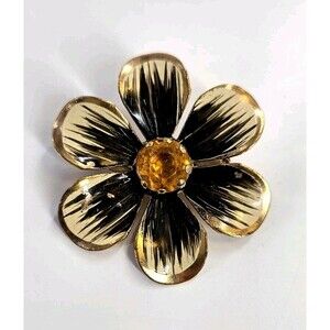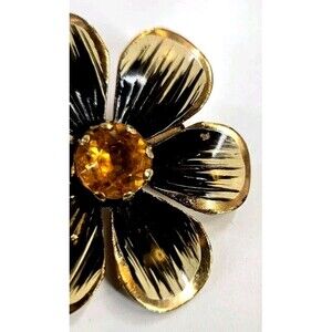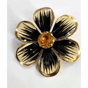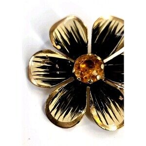 Gorgeous gold tone daisy with black enamaled accent pain on petals of a daisy with an Amber colored rhinestones center
