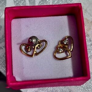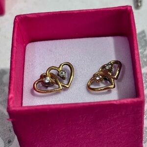 These gold earrings feature beautifully crafted heart-shaped designs, showcasing intricate detailing and embedded stones for a touch of elegance. The warm, yellow tone of the gold adds a classic charm, making them a perfect accessory for any occasion.