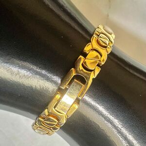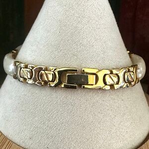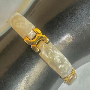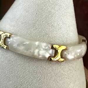 Elegant vintage bracelet featuring pearly white Lucite links with a soft, luminous sheen, framed by polished gold-tone “H”-style connectors. The glossy, faux mother-of-pearl effect gives it a chic, timeless vibe that pairs beautifully with both casual and dressy looks. Lightweight and comfortable to wear with a secure fold-over clasp.