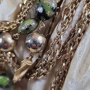This lovely piece measures 17 1/2" from hook clasp to end gold tone ball. Eleven strands of artfully placed graduated strands include chains, gold tone spheres, cylindrical twist beads, olive green beading with gold and black flecks