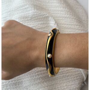 Vintage matte gold. black enamel and pearl spacers bangle. Its in good condition with some light wear on the edges and inside.