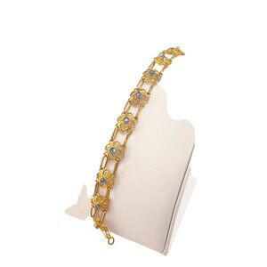 This exquisite vintage bracelet features a beautiful floral design, intricately crafted to showcase its gold-plated finish. Adorned with striking blue gemstone accents, it adds a touch of elegance and sophistication to any outfit. The detailed craftsmanship and classic design make it a timeless piece, ideal for collectors and fashion enthusiasts alike.