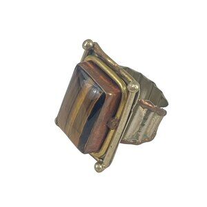 This striking vintage ring showcases a richly colored tiger's eye gemstone in a rectangular cut, framed elegantly in gold-plated metal. Its adjustable band ensures a comfortable fit, making it both versatile and stylish. The warm hues of the tiger's eye exude a natural elegance, perfect for adding a bold accent to your attire.
