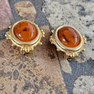 Elegant vintage earrings featuring faux amber stones in a gold-tone setting. Clip-on closure for easy wear. Unique addition to any jewelry collection.