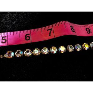 This 15-inch, choker-style necklace sparkles with prong-mounted aurora borealis rhinestones in two sizes, with the bigger stones grouped side-by-side in the front, and the smaller ones graduating around the sides and back. The hook closure allows the option to adjust the tightness, and if more length is needed, chain extenders can be purchased from your local jeweler or craft store.