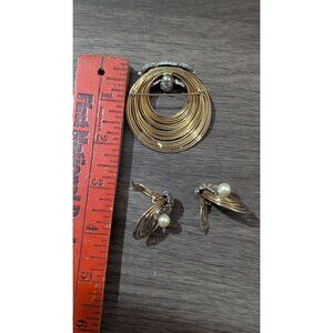Vintage Gold-Tone Brooch & Clip-On Earrings Set With Faux Pearls & Rhinestones