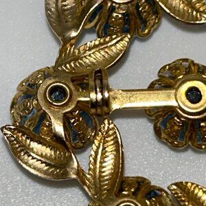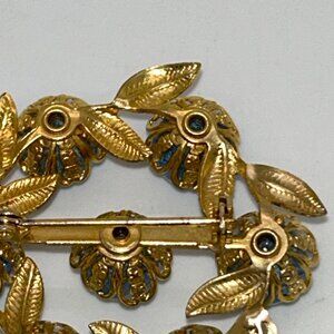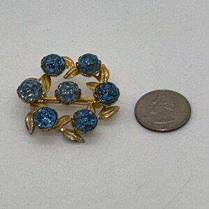 Vintage Gold-Tone Brooch With Blue Crackle Glass Stones & Leaf Design Rivet Set