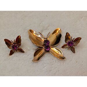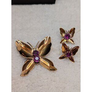 Vintage Gold-Tone Butterfly Brooch & Screwback Earrings W/ Pronged Rhinestones