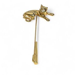 Vintage Gold-Tone Cat Themed Hat Pin With Clear Crystal Rhinestone Eyes 2"