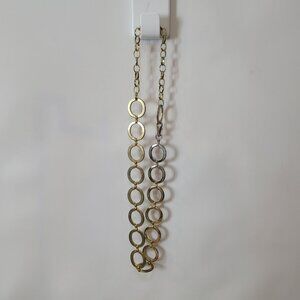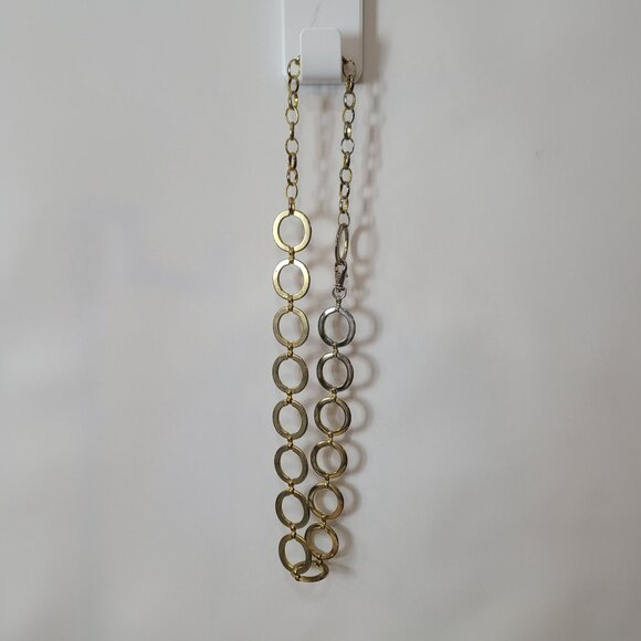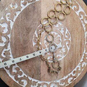This Vintage gold-tone chain link belt exudes elegance with its circular ring accents and versatile design. Crafted with care, it adds a sophisticated touch to any outfit. Measuring approximately 24 inches, it features a secure clip closure, combining functionality with style. Its statement-making appeal makes it a versatile accessory for various looks.
