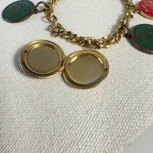 Minor wear on charms from age; locket opens and closes securely. Chain length = 7.5 inches.