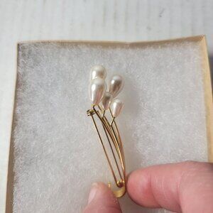 A timeless brooch featuring faux pearl drops on elegant gold-tone stems. Adds sophistication to formal wear or unique charm to casual outfits.