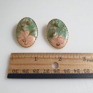 Vintage Gold-Tone Clip-On Earrings With Swirled Green & Peach Enamel Design