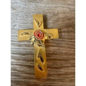 Vintage Gold-Tone Cross Pendant With Red Rose & Leaf Detailing - Don-Lin Religio