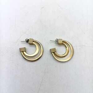 These gold-tone double hoop earrings echo the elegance and charm of a bygone era. Their unique intertwined design captures the eye, while the warm gold hue complements various skin tones. A timeless accessory that enhances both contemporary and classic outfits with subtle sophistication.