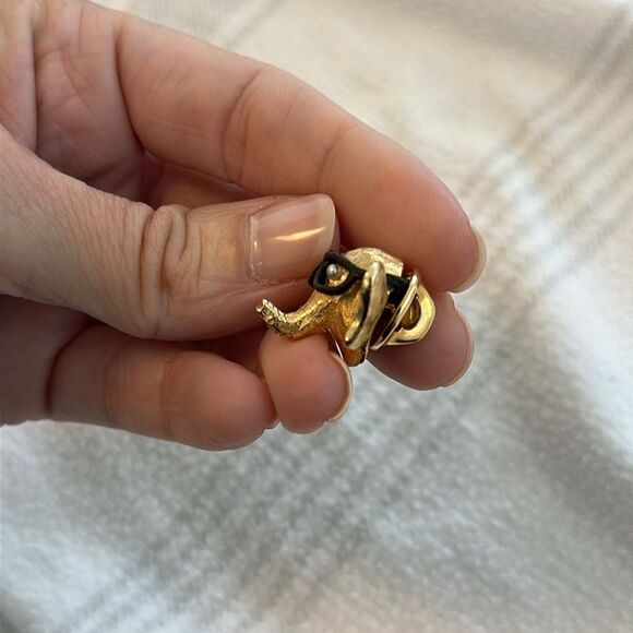 Vintage Gold Tone Elephant Lapel Pin Brooch with Black Glasses