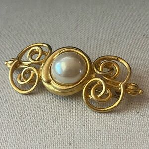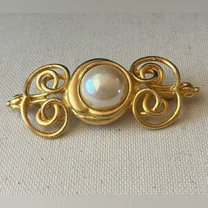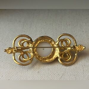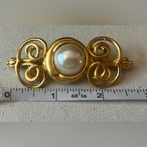 Stunning vintage-style gold-tone brooch featuring a large faux pearl center and elegant openwork filigree scroll detailing. This ornate piece adds a timeless, regal flair to any outfit—perfect for dressing up a jacket, scarf, or hat. Measures approximately 2.25 inches in width. Secure pin-back closure.