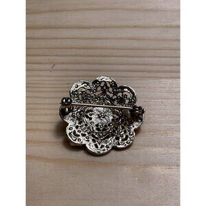 • Gold-tone filigree design • Faux pearl centerpiece • Secure pin-back closure