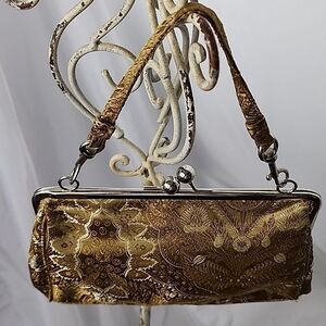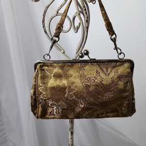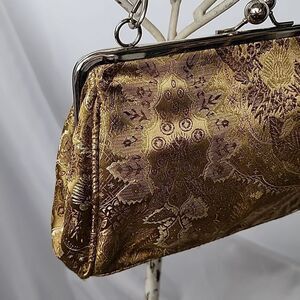 Vintage metallic gold tone floral fabric evening bag with silver tone hardware & kiss lock. Matching clutch handle is removable.