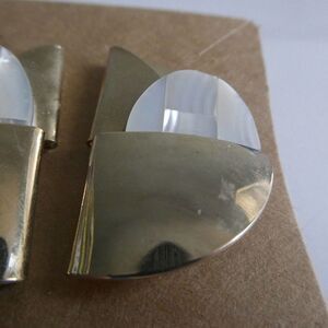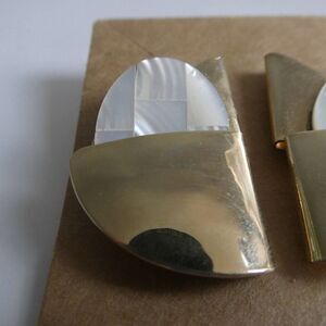 Beautiful folded gold tone stud earrings with brick-like carved mother of pearl. They could use a polishing but are in great condition.