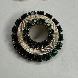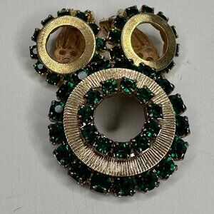 Elegant vintage set featuring a pair of clip-on earrings and a matching brooch adorned with sparkling green rhinestones, set in gold-tone metal.
