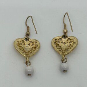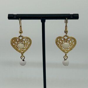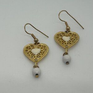 Vintage Gold-Tone Heart Drop Earrings With White Accents & Filigree Design
