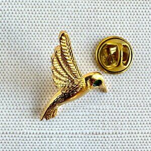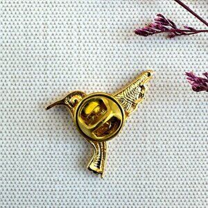 A small, lightweight accessory featuring a detailed hummingbird design, gold-tone finish, and a green eye accent. Versatile for hats or lapels.