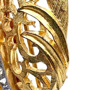 This brooch features a graceful leaf design with intricate gold-tone filigree and a sparkling rhinestone-accented stem. A timeless and elegant accessory.