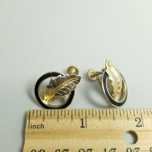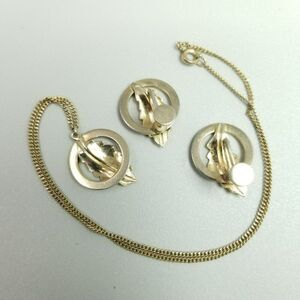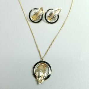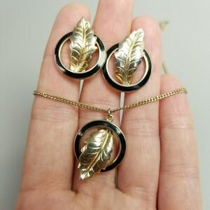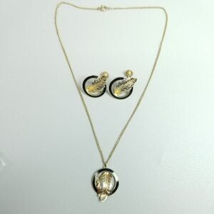 Vintage Gold Tone Leaf and Black Enamel Jewelry Set, Clip On Earrings Necklace