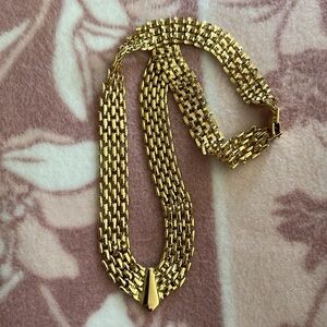 Turn heads with this bold vintage collar necklace featuring a layered gold-tone mesh link design and a sleek V-shaped center accent. This piece brings sophistication and edge—perfect for special occasions, professional attire, or elevating your everyday look. Its timeless design makes it a standout addition to any vintage or costume jewelry collection.