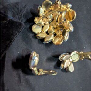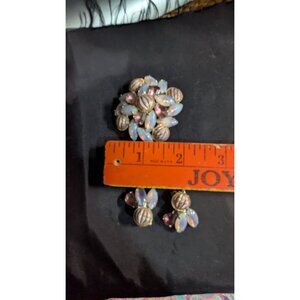 Vintage Gold-Tone Opalescent Brooch & Clip-On Earrings Set With Pink Accents Est