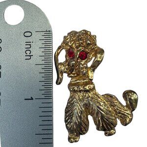 This charming vintage brooch features a gold-tone poodle adorned with vibrant red rhinestone eyes. A delightful piece of jewelry for collectors.