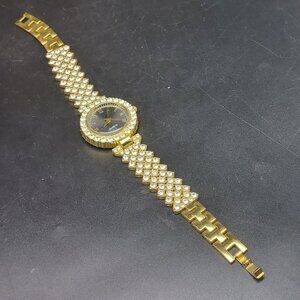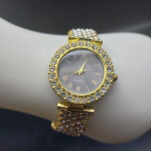 Vintage Gold-Tone Quartz Watch With Rhinestone Bezel & Band Works New Battery