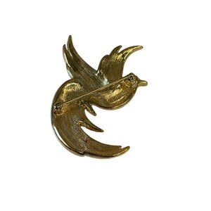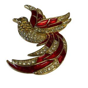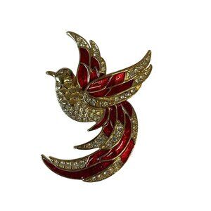 Vintage Gold-Tone & Red Enamel Bird Brooch With Rhinestone Accents By Giorgio
