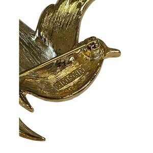 This Giorgio brooch showcases a graceful bird design, combining red enamel with sparkling rhinestones. Its vintage appeal is enhanced by gold-tone craftsmanship.
