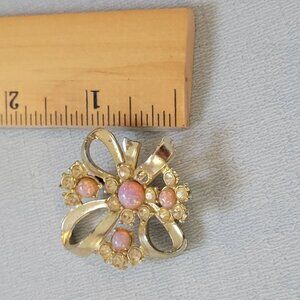 This elegant vintage brooch showcases a classic bow design adorned with sparkling rhinestones and opalescent pink accents. The gold-tone finish adds sophistication, making it a distinguished accessory for formal attire.