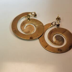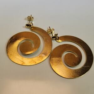 These vintage gold-tone spiral earrings feature an eye-catching design that seamlessly blends elegance with boldness. The dynamic spiral shape creates a playful yet sophisticated look, making them a standout piece in any jewelry collection. Crafted from high-quality gold-tone metal, the earrings shine with a polished finish, adding a modern flair to any outfit. Measuring approximately 2 inches in diameter, these earrings are the perfect size to make a statement without overpowering your style. The secure post-back closure ensures comfort and a snug fit, allowing you to wear them confidently all day or night. Whether you're dressing up for a special event or adding a touch of gold to your everyday look, these spiral earrings are the ideal accessory. Their timeless design makes them versatile enough to complement both casual and formal attire. Elevate your jewelry collection with these vintage gold-tone spiral design earrings, combining bold style and timeless elegance.