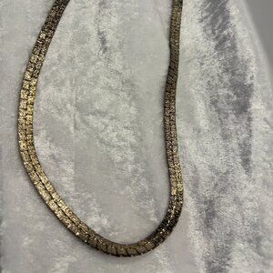 Shine bright in this vintage matching jewelry set from the 1980s! Featuring a bold, flat-link gold-tone necklace and coordinating bracelet, both pieces showcase a rich textured finish for maximum retro glam. Lightweight, flexible, and comfortable to wear.
