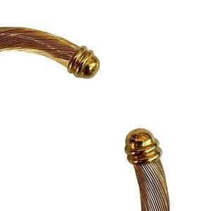 Bold and chic gold-tone collar necklace with a twisted cable design and rounded end caps. Rigid torque style that slips easily around the neck and sits beautifully above the collarbone. Perfect statement piece for dressing up a simple blouse, dress, or even layered with longer chains.