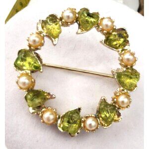 Vintage Gold-Tone Wreath Circle Brooch With Pearl & Green Stone Accents MCM