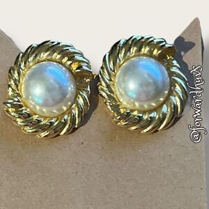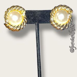 These vintage earrings feature a refined gold-tone finish surrounding a beautiful faux pearl center, capturing a timeless and sophisticated style. The structured design enhances the elegant contrast between the warm gold-tone metal and the smooth pearl, making them a versatile accessory for both formal and everyday wear. Measuring approximately 1 inch by 1 inch, they offer a balanced size that is noticeable yet understated.