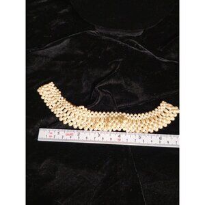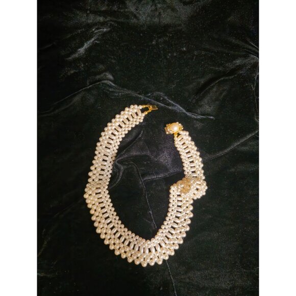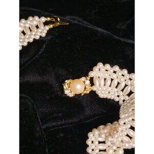 This choker necklace exudes timeless elegance with its gold-toned clasp adorned with pearls and rhinestones. The intricate layered pearl design radiates sophistication, making it a treasured accessory for formal occasions or as a collector's piece reminiscent of vintage glamour. Its craftsmanship showcases an era of meticulous detail and lasting beauty.