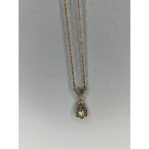 Vintage Gold-Toned Teardrop Pendant Necklace with Crystal Accents, Elegant