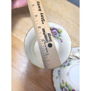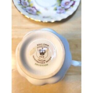 This rare vintage Golden Crown E&R Bone China Teacup Saucer Set "Devotion" from the Remembrance series features a beautiful floral pattern in a multicolor design. The round-shaped set includes a tea cup and saucer perfect for serving hot or cold beverages. Made of high-quality bone china with painted decorations and a handle, this original set is a unique addition to any tea or dinnerware collection. Ideal for collectors or those looking to add a touch of elegance to their kitchen or dining room.