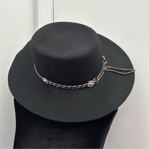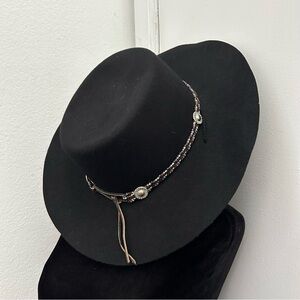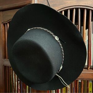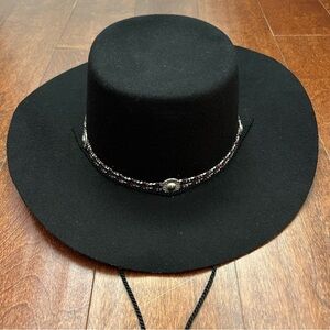 Stylish black hat featuring a decorative band with silver accents. Perfect for adding a touch of western style to any outfit.