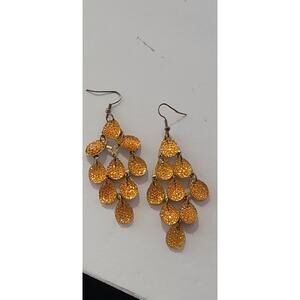 The earrings in the image are vintage-style drop earrings with a distinctive golden texture. They feature multiple teardrop elements that are intricately designed to reflect light beautifully. The teardrops are arranged in a cascading fashion, creating a luxurious and eye-catching effect. Each teardrop is covered in small, textured facets that enhance the overall sparkle and shine.